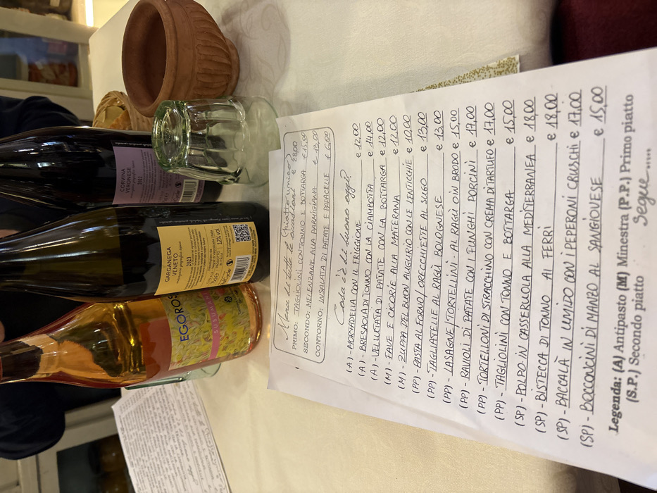 The image depicts a dining table in a restaurant in Bologna, Italy, covered with a white tablecloth. Four bottles are arranged on the table: an amber-colored bottle labeled "EGOROS SUSUMANIELLO," a dark green bottle with a yellow label indicating "GARGANAGA VENETO 2023," a dark bottle with a purple label for "CORVINA VERONESE 2022," and a fourth, mostly obscured bottle. Adjacent to the bottles, an inverted clear glass tumbler with vertical ridges and a small, reddish-brown terracotta-style pot are present. In the foreground, a handwritten menu on white paper details various Italian dishes and their prices, with sections like "Menù di tutte le occasioni" and "Cosa c'è di buono oggi?". Specific items listed include "Tagliolini con tonno e bottarga" (€15,00), "Lasagne/Tortellini al ragù in brodo" (€15,00), and "Polpo in casseruola alla Mediterranea" (€18,00). A legend defines (A) Antipasto, (M) Minestra, (P.P.) Primo piatto, and (S.P.) Secondo piatto. A person's upper arm and shoulder are partially visible in the top left quadrant of the frame, indicating a seated individual. Another handwritten document is partially visible on the far left.