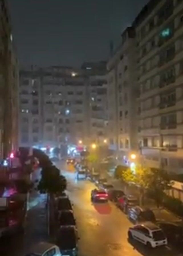 The video depicts a rainy night on a city street lined with tall apartment buildings