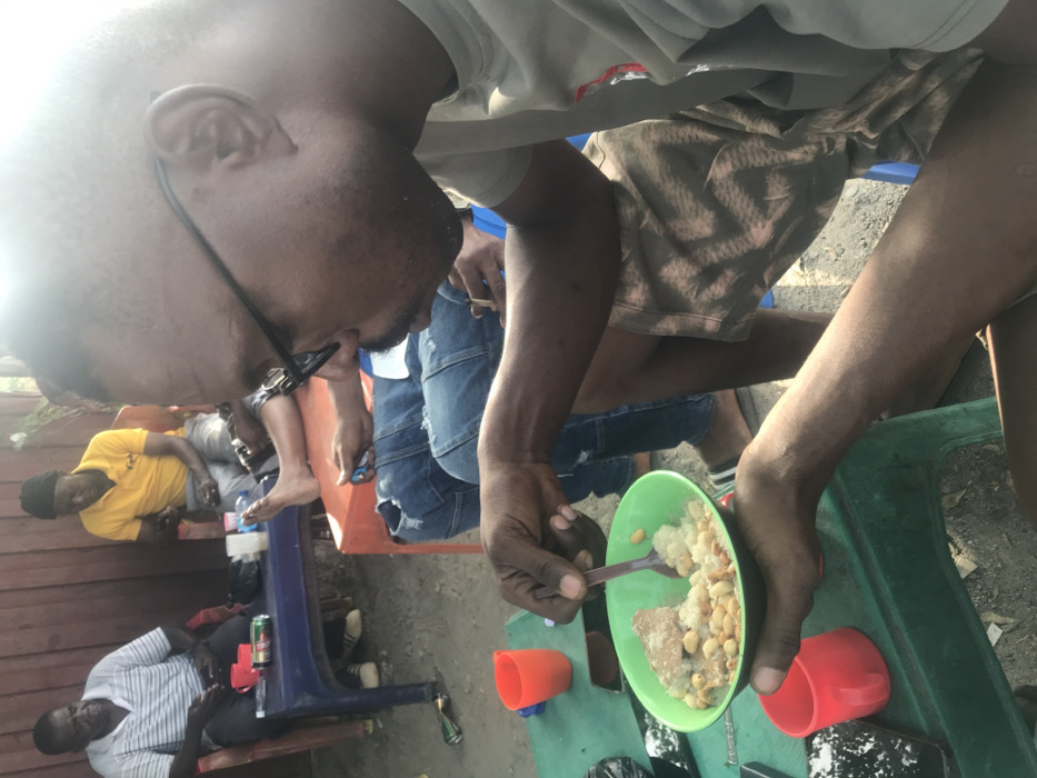 In Bwari, Nigeria, four adult males are observed in an outdoor or semi-open setting featuring simple plastic furniture. In the foreground, a dark-skinned male wearing glasses, a light-colored short-sleeved shirt, and patterned shorts is seated, actively consuming food from a green plastic bowl using a purple plastic spoon. The bowl contains a mixture of a light-colored starchy substance, light brown beans or nuts, and a piece of meat. Adjacent to him, a green plastic table displays two red plastic cups and a black smartphone. In the mid-ground, a second dark-skinned male is partially visible, seated on an orange plastic chair, wearing ripped blue jeans and flip-flops, holding a small object in his left hand. His bare right foot rests elevated. In the background, two additional dark-skinned males are seated at a dark blue plastic table positioned against a reddish-brown wooden wall. The male on the far left wears a striped white and grey polo shirt and dark trousers, appearing focused on an item in his hands. A green bottle, a red cup, and a black bag are on his table. Next to him, a fourth male in a yellow polo shirt and a dark cap is also observed looking downwards at an object in his hands. The ground consists of a light-colored, unpaved surface, and the scene is illuminated by strong daylight. The individuals are engaged in eating and personal activities within a casual gathering.
