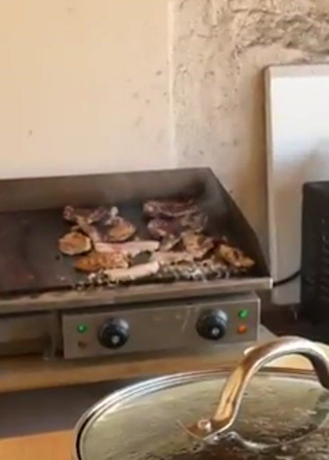 - "The camera pans up from a covered pot to a flat-top grill with pieces of various meats cooking" by FM-i29EC2, licensed under CC BY 4.0