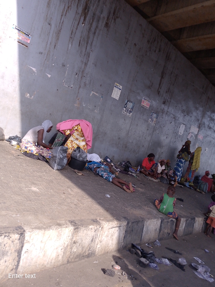 group of people, likely women and children, sitting and lying down under what appears to be a bridge or overpass in Adankolo, Nigeria