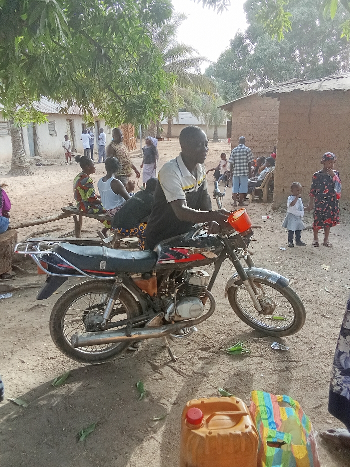The scene takes place in Gundzhe, Nigeria, located at latitude 8.981 and longitude 8.395. A man is seated on a black motorcycle with a silver frame. The motorcycle is parked in a sandy area, and a few other people are gathered nearby. The man is wearing a yellow and black striped shirt and appears to be holding an orange plastic cup. There is a small child in a pink dress standing near the man. To the left of the motorcycle are a few other people. There is a large tree in the background. Several buildings with mud brick walls can also be seen. Two yellow plastic containers and one multicolored plastic container are on the ground nearby. There are numerous green leaves scattered about the ground.