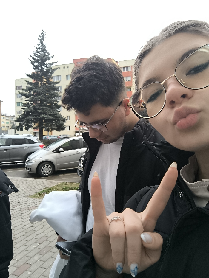 A selfie-style photograph captures a young female and male outdoors in Pernik, Bulgaria, under an overcast sky