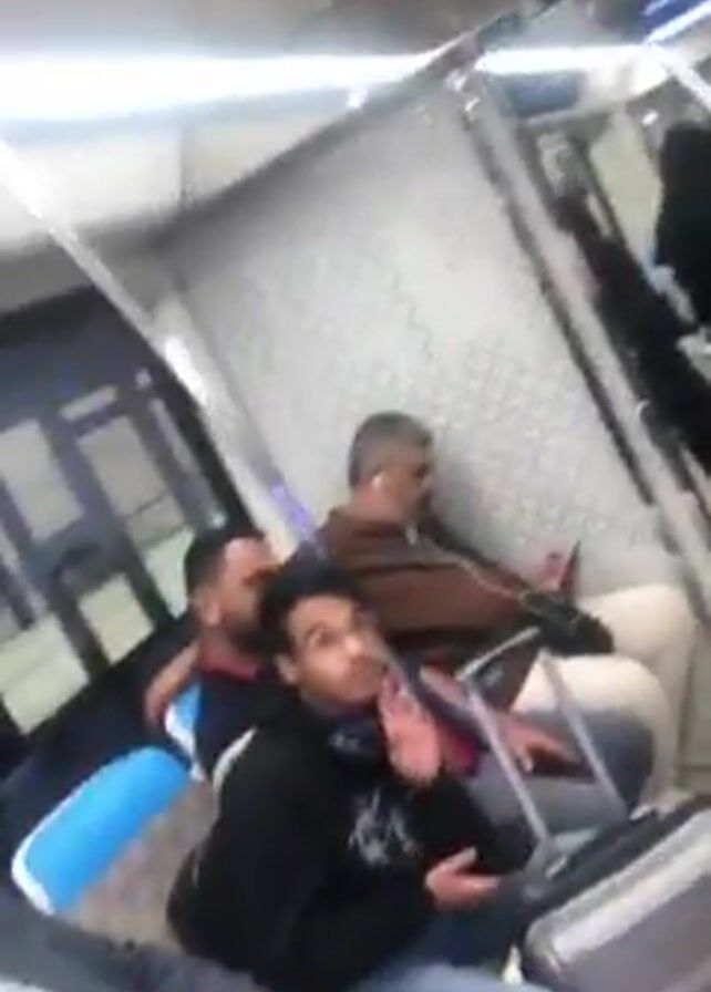 interior of what appears to be a train car. Several people are sitting, some looking at their phones. A gray suitcase sits on the floor. Some of the people are wearing casual clothes like jeans and t-shirts, while one man is wearing a traditional white thobe. The lighting is bright. The camera moves around slightly, capturing different seated passengers.