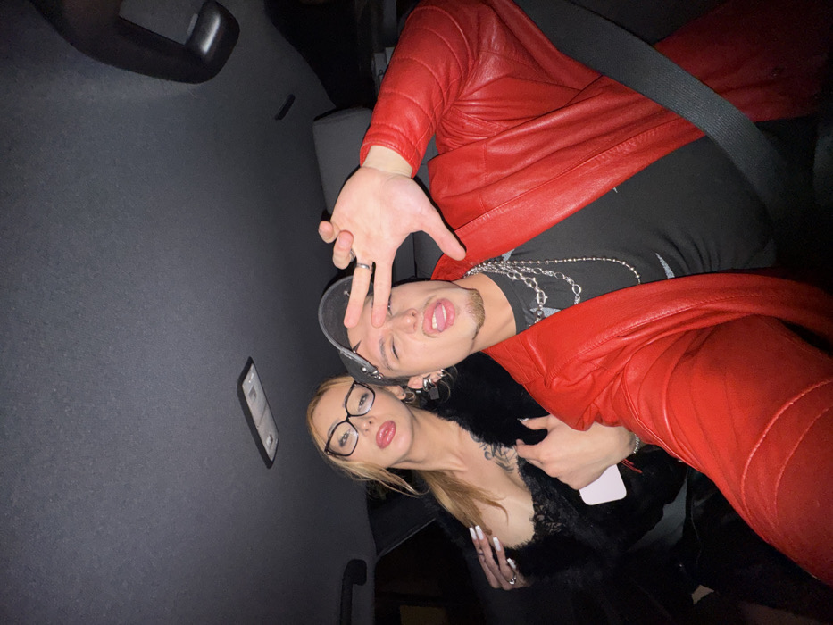 The image depicts two individuals, a female and a male, inside the passenger compartment of a vehicle, specified as located in Asnières-sur-Seine, France. The scene is illuminated by an internal light source, suggesting a low-light or nighttime setting. The female subject is positioned on the left, slightly behind the male. She has light-colored hair, pulled back into a ponytail, and wears dark-rimmed eyeglasses. Her mouth is slightly open, with her tongue partially visible. She is dressed in a black garment, possibly lace or sheer, with a plunging neckline, covered by a black faux fur or feathered wrap. Her hands display rings and long, white manicured nails; her right hand holds a light-colored mobile phone against her chest. The male subject is in the foreground, on the right. He wears a black baseball cap backward, a red leather jacket over a black t-shirt, and multiple silver-toned chains around his neck. He has a goatee, an open-mouthed expression with his tongue visible, and squinting eyes. His left hand is raised, forming a peace sign (V-shape). Multiple earrings, including hoops and a cross-shaped drop, are visible on his ears, and he wears rings on his left hand. A black seatbelt crosses his right shoulder and chest. The vehicle's gray headliner is visible at the top of the frame, along with a rectangular overhead light fixture. Both individuals are looking towards the camera, suggesting a self-portrait (selfie).