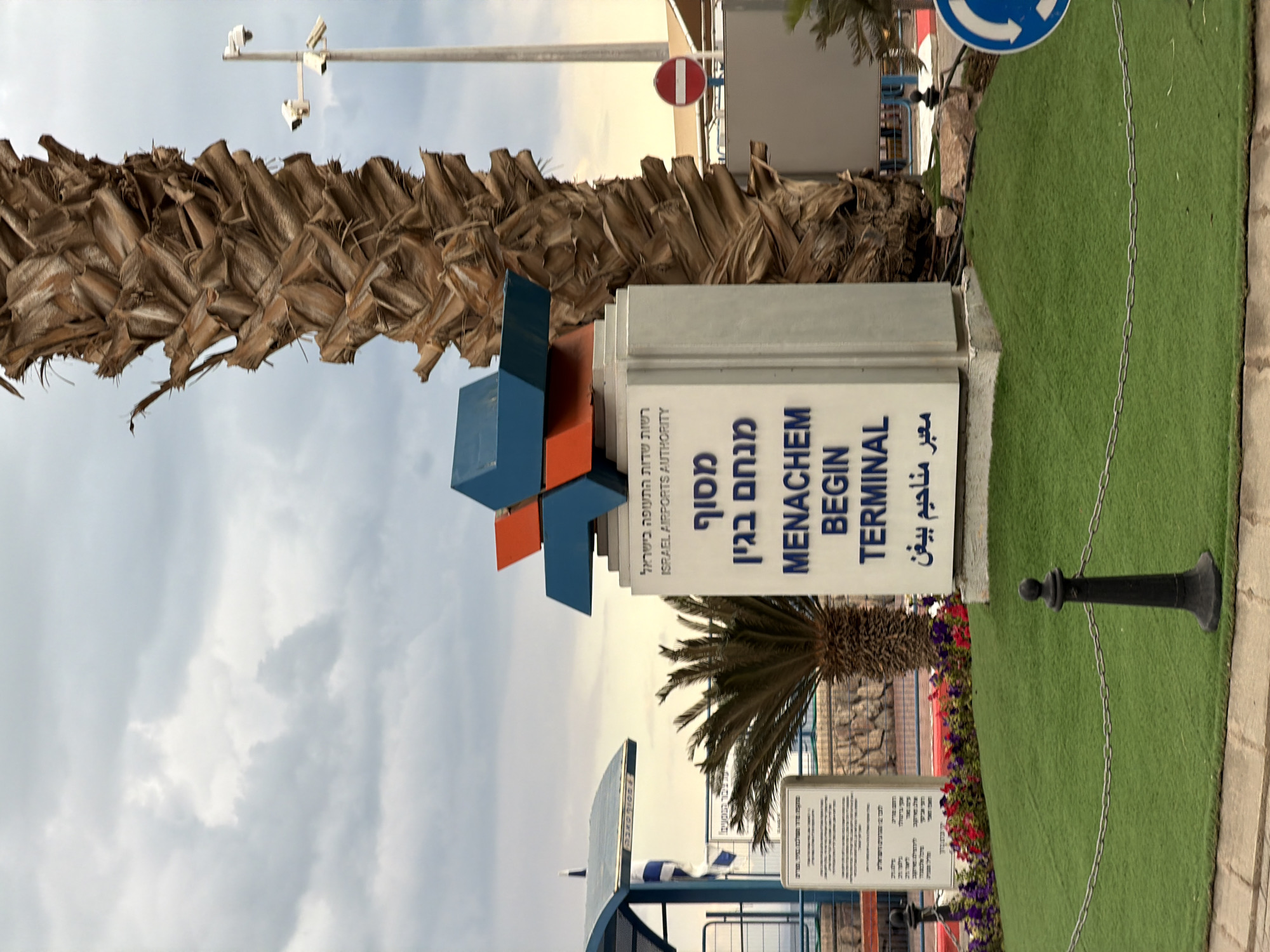 An outdoor scene captures the entrance area of the Menachem Begin Terminal in Eilat, Israel, likely a border crossing or port facility. The central feature is a white rectangular sign displaying "MENACHEM BEGIN TERMINAL" in English, Hebrew, and Arabic, beneath the blue and orange geometric logo of the Israel Airports Authority. The sign is situated on a patch of artificial green grass, bordered by black bollards connected by a silver chain. To the left of the main sign, a smaller palm tree with green fronds stands behind a vibrant bed of red and purple flowers. Further left, a white information sign with Hebrew text is visible next to a light blue metal-framed structure with a curved roof, possibly a shelter or part of a checkpoint, behind which a portion of an Israeli flag is discernible. A stone retaining wall runs horizontally in the background on this side. Dominating the right side of the frame is the rugged, brown trunk of a large palm tree. Behind it, a light-colored pole with two security cameras is visible, along with a partially obscured red circular "no entry" traffic sign. A blue circular traffic sign is partially visible on the ground level to the far right. The sky overhead is heavily overcast with gray and white clouds. No individuals or active vehicles are present in the scene.