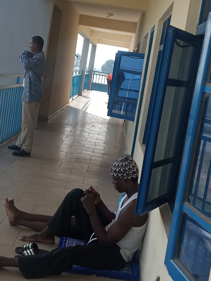 The scene depicts a covered outdoor corridor or balcony on an upper floor of a building in an unknown city. The floor is tiled with light-colored rectangular pavers. Light beige walls line the corridor, with a blue metal balustrade on the left side and several blue-framed windows on the right, one of which is open and angled outwards. Two dark-skinned males are present. On the left, a male stands facing right, dressed in a patterned long-sleeved shirt and light-colored trousers, with black slip-on shoes. His hands are raised and clasped near his chest. In the foreground on the right, another male sits on a small blue patterned mat, leaning against the wall. He is barefoot, wearing a white tank top, black trousers, and a patterned beanie. A pair of black-and-white striped slides rests near his feet. His hands are held together in front of him, and he is looking downwards. In the distant background, beyond the balustrade, a third individual wearing an orange shirt is partially visible, bent over. The area is brightly illuminated by natural sunlight, creating distinct shadows.