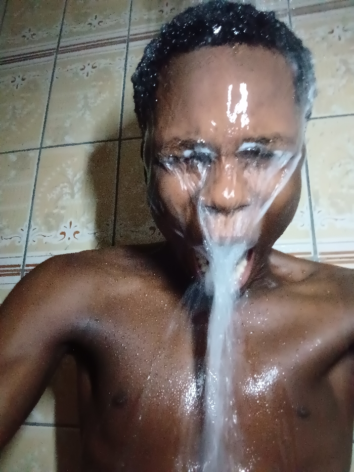 A dark-skinned person stands in a shower, eyes squinted against the falling water. Streams cover their face, running into their open mouth. The person’s dark, wet hair is slicked back. Shoulders and chest are visible, gleaming with moisture. The background features light-colored tiled walls.