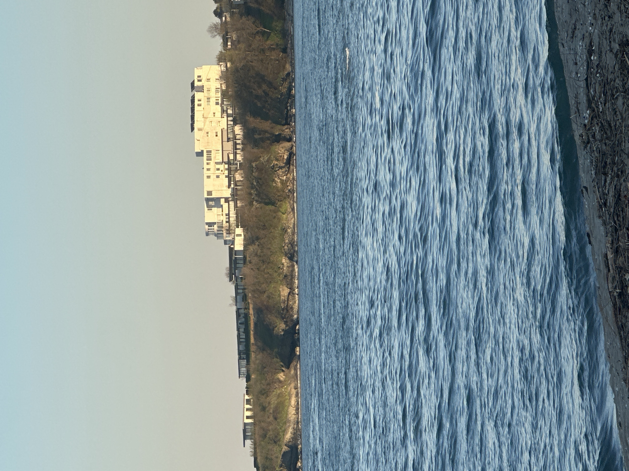 view of Kiten, Bulgaria. On the left side, a tall, white apartment building stands near the edge of a cliff or bank overlooking a body of water, presumably the Black Sea. A line of vegetation, including trees and shrubs, separates the building from the water. The sky is a clear, light blue. On the right, the water is textured with small waves, indicating a slight breeze. A concrete embankment or shoreline structure is visible in the right foreground.