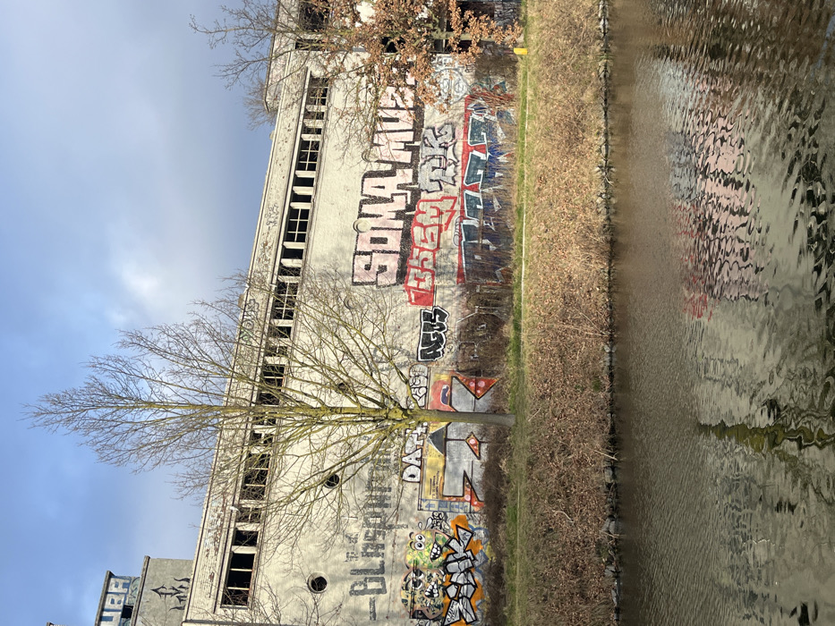 - "In Roubaix, France, an outdoor scene depicts a disused, light-colored industrial-style building situated across a canal under a partially cloudy sky" by FM-2aYl13, licensed under CC BY 4.0