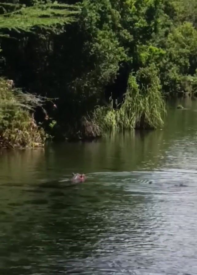Okay, here's a detailed description of the video: The video presents an outdoor scene, specifically a body of water that appears to be a river or wide stream. The water is murky and dark green in color, with visible ripples and reflections on the surface. The banks of the water feature are densely vegetated with various types of green trees and foliage. In the water, a hippopotamus can be seen. It is visible with its head and part of its back above the surface. The hippo swims through the water from left to right. The environmental setting suggests a natural or semi-natural landscape, likely a subtropical or tropical area due to the dense and verdant vegetation. There are no immediately visible signs of human-made structures or significant alterations to the natural environment. The overall conditions appear to be daytime, with adequate natural light for clear visibility.