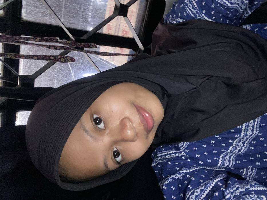 A woman wearing a black hijab looks directly at the camera with a gentle smile. Her skin is smooth and her lips are slightly glossy. She is positioned at an angle, with a window and floral tie visible in the background. Part of a blue and white patterned fabric is visible, suggesting she may be sitting or lying on a bed or couch. The image is well-lit, highlighting the woman's features.