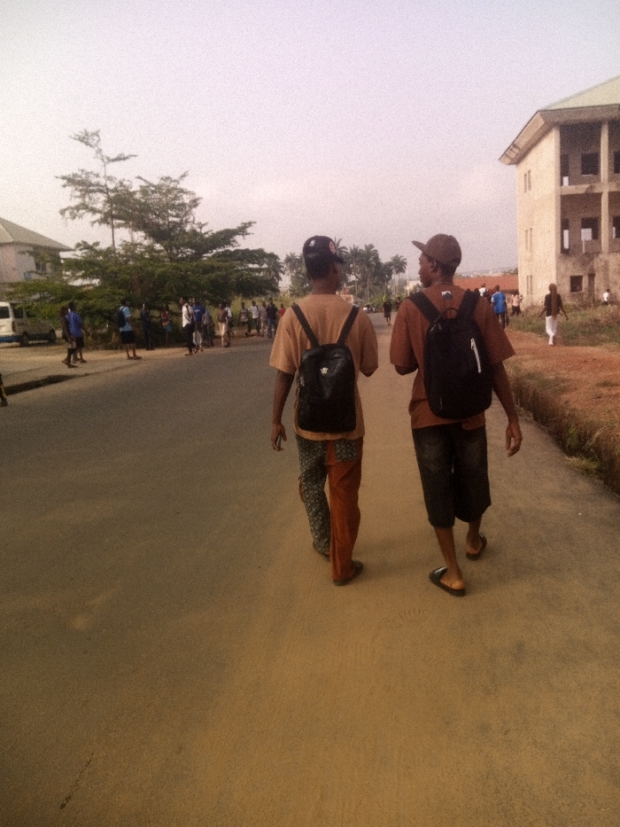 Two people walk down a sun-drenched street away from the viewer. Both wear t-shirts and backpacks. The figure on the left sports patchwork pants, while the other is in dark shorts. Many people stand along the street, near a parked van and some trees. An unfinished building is visible to the right. The sky is pale and overcast.