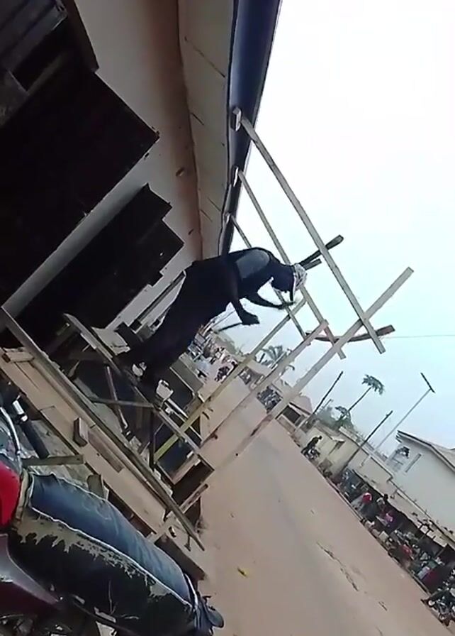 A man is working on a building under construction using a makeshift wooden scaffold. He is dressed in dark clothing and appears to be attaching or adjusting something to the building's exterior, high above the ground. The scaffold is rudimentary, consisting of wooden planks and supports. A motorcycle is parked nearby. The scene is set on a street with other buildings, pedestrians, and vehicles visible in the background, indicating an urban or semi-urban environment. The weather seems overcast. The camera angle is low, looking upwards towards the worker and the building.