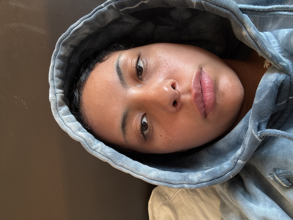 A close-up portrait shows an individual, appearing to be an adult female, with dark hair, dark eyes, and visible freckles on her cheeks. She is wearing a light blue hooded sweatshirt with a tie-dye or distressed pattern, and the hood is pulled up, framing her face. A small, golden-colored septum piercing is visible on her nose. Her gaze is directed straight ahead, towards the camera. The background consists of a plain dark brown surface on the upper and right portions of the frame, and a light-colored, soft object, possibly a pillow or bedding, visible to the left of the individual's shoulder. The scene depicts an indoor, private environment. No discernible features within the image indicate a specific location in Mexico City, Mexico.