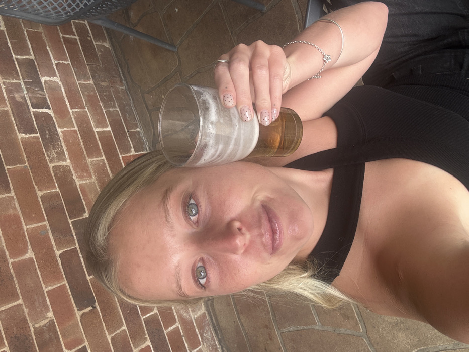A selfie shows a blonde-haired woman with light eyes holding a beer glass with her hand