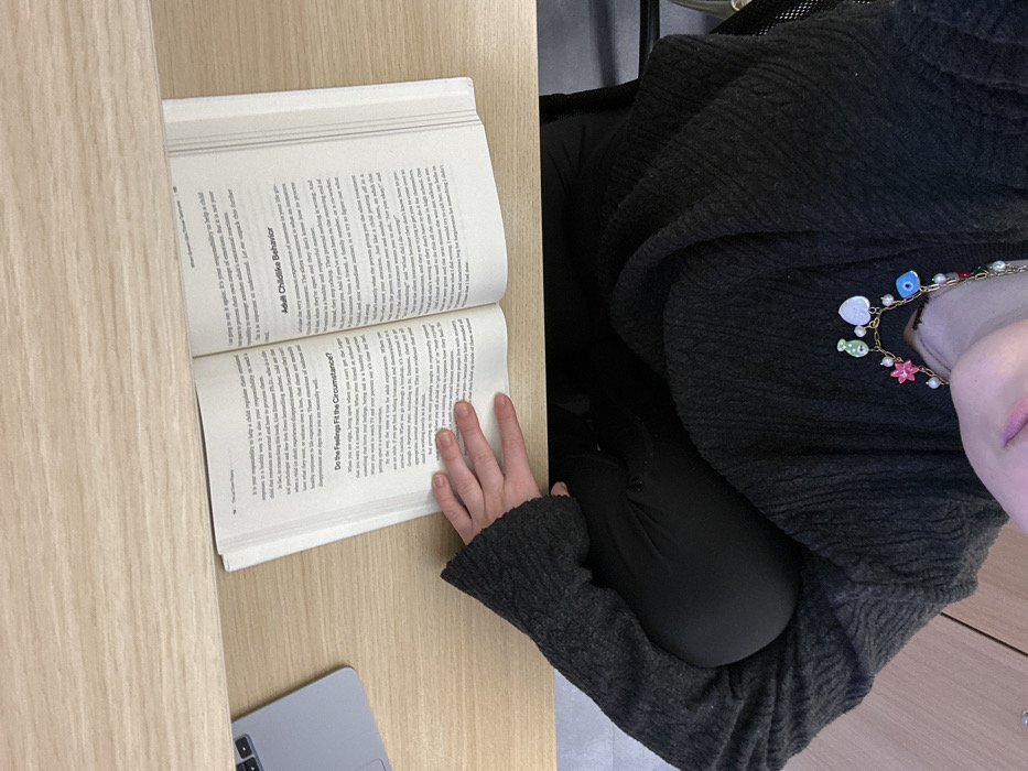 The image displays a high-angle, close-up view of a person seated at a light-colored wooden desk in an indoor setting in Madrid, Spain. The person is partially visible from the lower face (chin and mouth) down to the lap, wearing a dark grey, textured long-sleeved sweater and dark pants. A gold-colored chain necklace with various charms, including a blue evil eye, a white heart, a green fish, a pink flower, and small white and colorful beads, is worn around the neck. An open hardcover book with white pages and black text, featuring titles like "Adult Childlike Behavior," lies flat on the desk, with the person's right hand resting on its right page. A silver laptop, showing a portion of its keyboard, is partially visible on the desk to the right of the book. The scene indicates a study or work activity within a functional indoor environment.