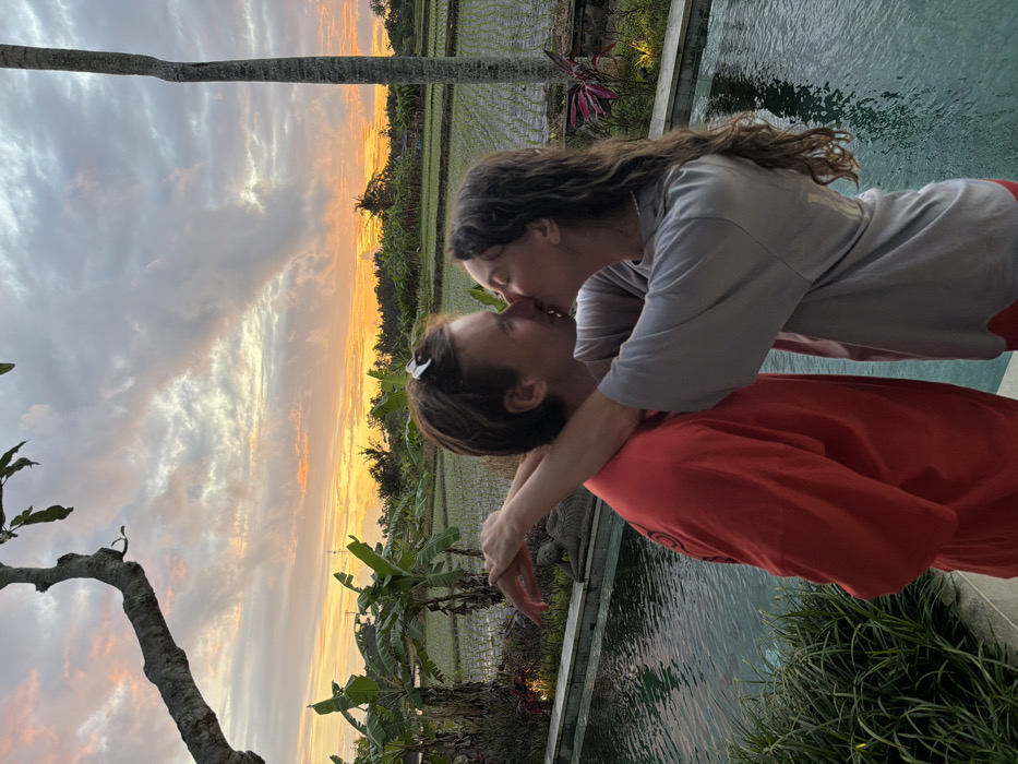 The image depicts two individuals engaged in a kiss beside a swimming pool in Mas, Indonesia, at sunset