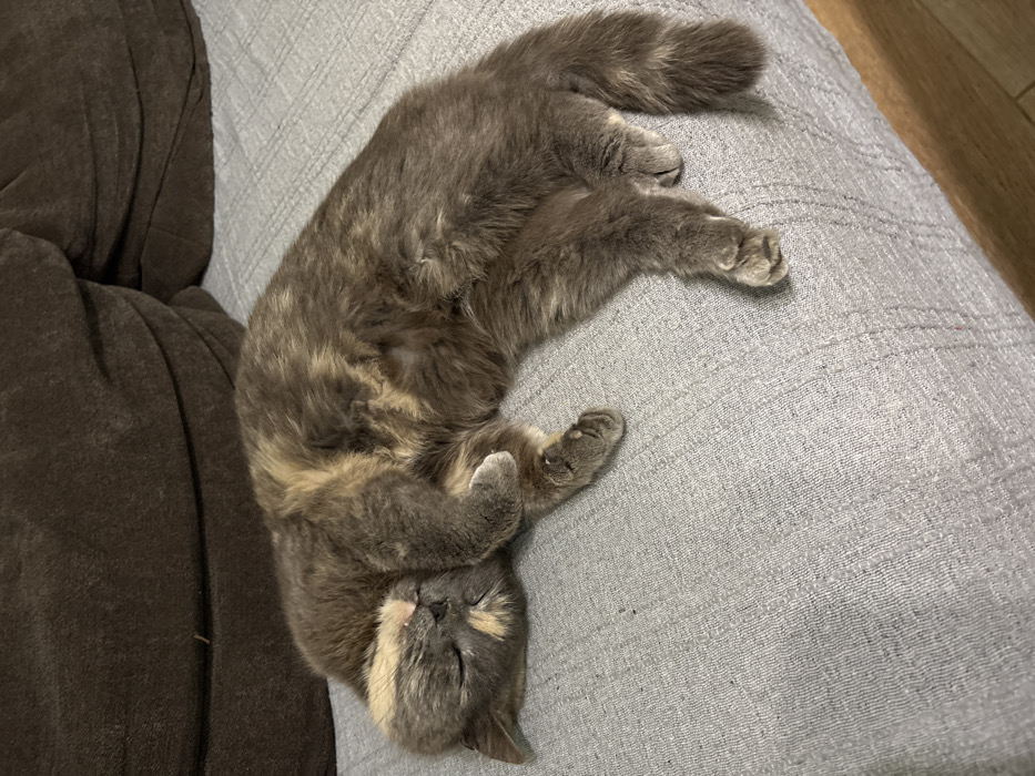 - "A tortoiseshell-patterned domestic cat is observed sleeping on a light grey upholstered sofa in an indoor setting within the city of Podslon, Bulgaria" by FM-tpJH42, licensed under CC BY 4.0