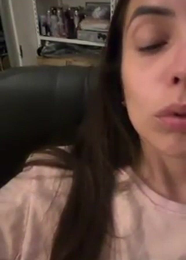 woman sitting in a black chair wearing a pink t-shirt. Her long, dark hair is visible. She is holding a small, lit cigarette between her fingers and putting it in her mouth. In the background is a shelf with various bottles and items. The video focuses closely on the woman's face.