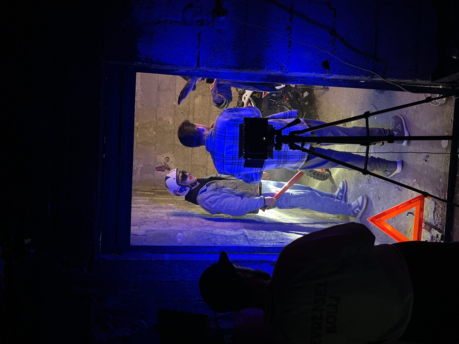 A dimly lit scene, possibly a film set, shows two people facing each other. One person wears a helmet and holds a baseball bat, while the other stands with a camera on a tripod, filming. An orange warning triangle sits on the ground near the person in the helmet. The scene appears to be in an underground or confined space with a person in the foreground wearing a shirt. The dominant colors are blue and dark gray, with harsh lighting creating strong shadows.