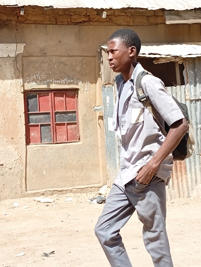 The scene, located in Gwagwarwa, Nigeria, depicts a young male walking right-to-left across an unpaved dirt path under direct sunlight