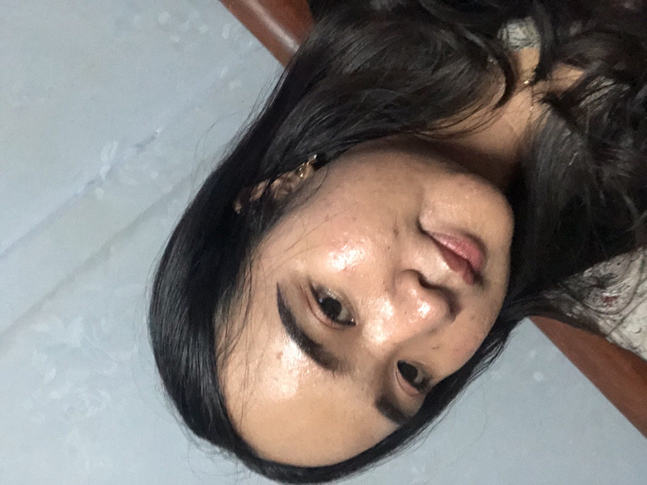The image is a close-up, slightly angled selfie portrait of an adult female
