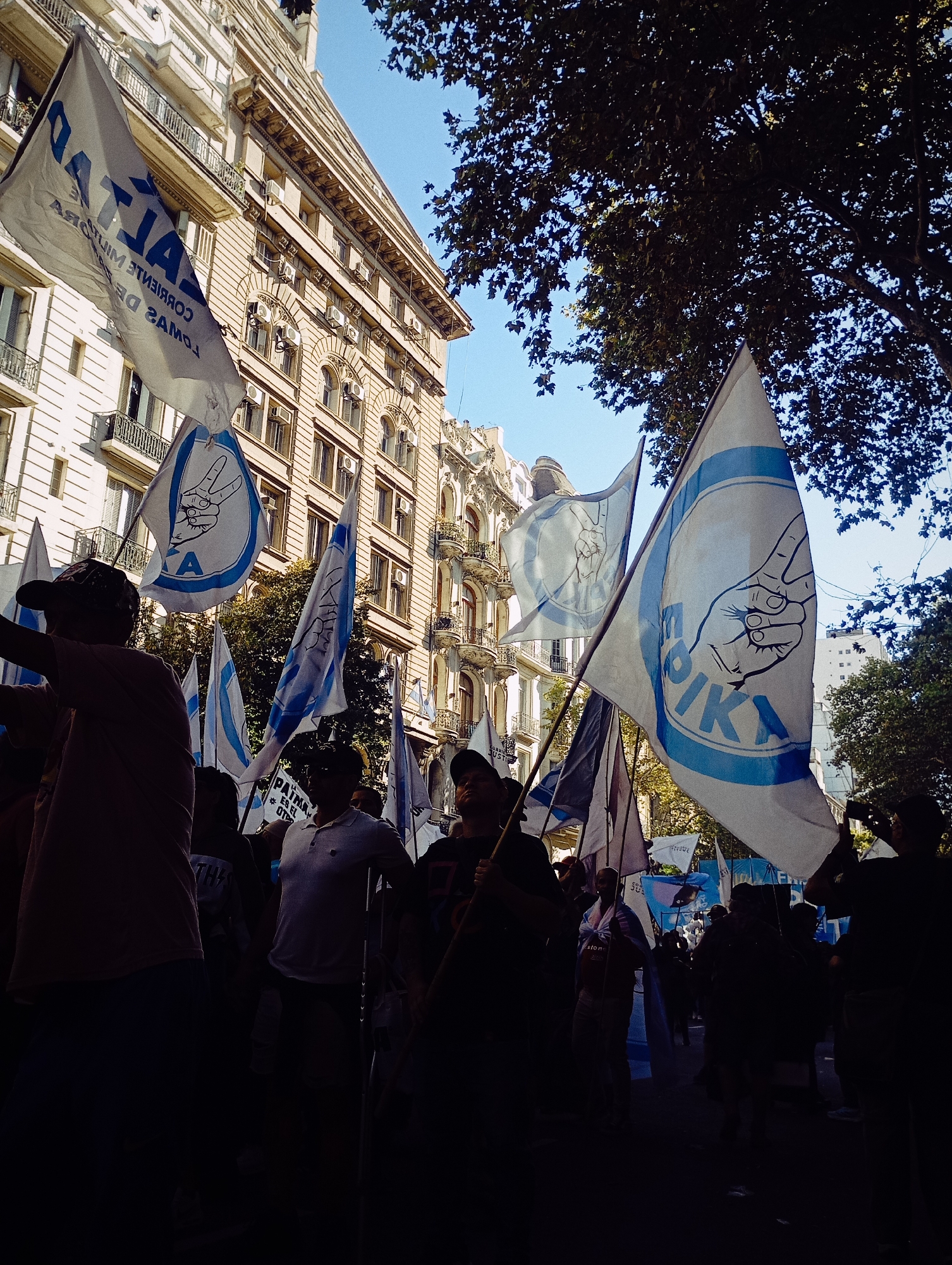 A midday street scene in Buenos Aires, Argentina, depicts a public demonstration likely taking place on Avenida de Mayo, characterized by its ornate, multi-story European-style buildings with balconies and numerous window-mounted air conditioning units. The setting is bright and sunny, with strong backlighting creating prominent silhouettes of the participants in the foreground. Numerous individuals are gathered, carrying tall white and light blue flags. Many flags feature a distinctive circular logo depicting a hand forming a "V" (victory) sign with two fingers extended. Text visible on these flags includes "SITRAIKA" on a prominent flag on the right, and "CORRIENTE MILITANTE TOMAS DE" (reversed) on a flag to the far left. In the immediate foreground, a person wearing a baseball cap is partially silhouetted on the left, holding one of these flags. To the right, another silhouetted individual is seen holding a camera or phone, seemingly documenting the event. In the mid-ground, a person wearing a light-colored polo shirt stands near a crutch or stick. Further in the background, additional demonstrators and banners are visible, with one banner partially legible as "PATRIA ES EL OTRO". Overhead, a clear blue sky is visible, partially obscured by the dark, silhouetted foliage of mature trees lining the thoroughfare.