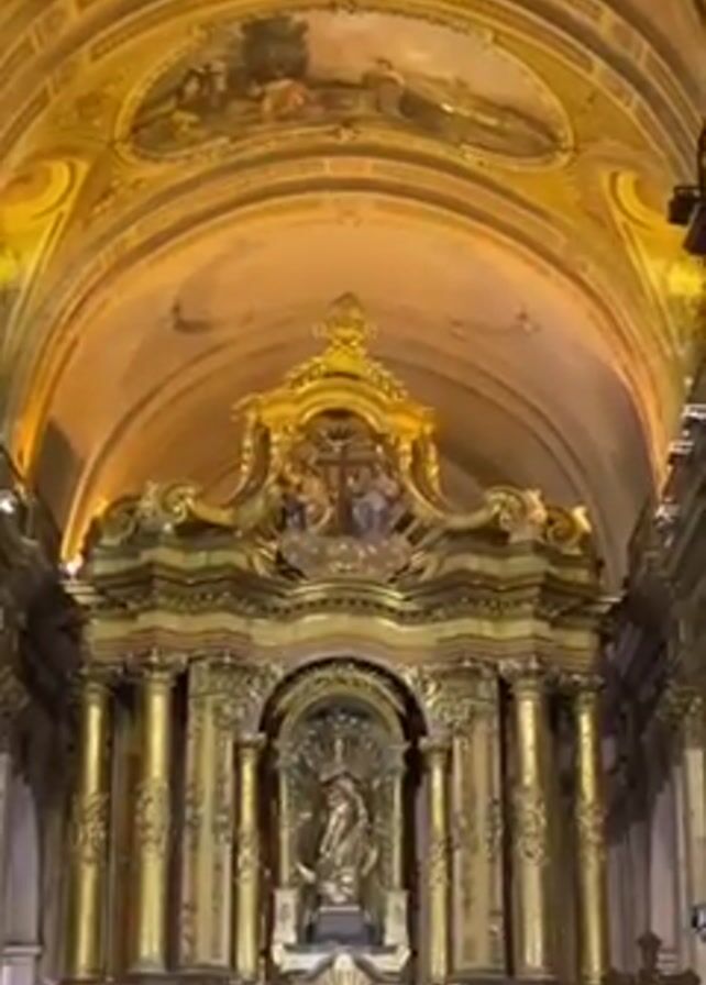interior of a church. The camera pans upward from the altar, elaborately decorated in gold, to the ceiling. The ceiling is also ornate, with paintings and a dome containing a stained-glass window and Latin text. The overall color scheme is gold and brown. There are people near the altar.