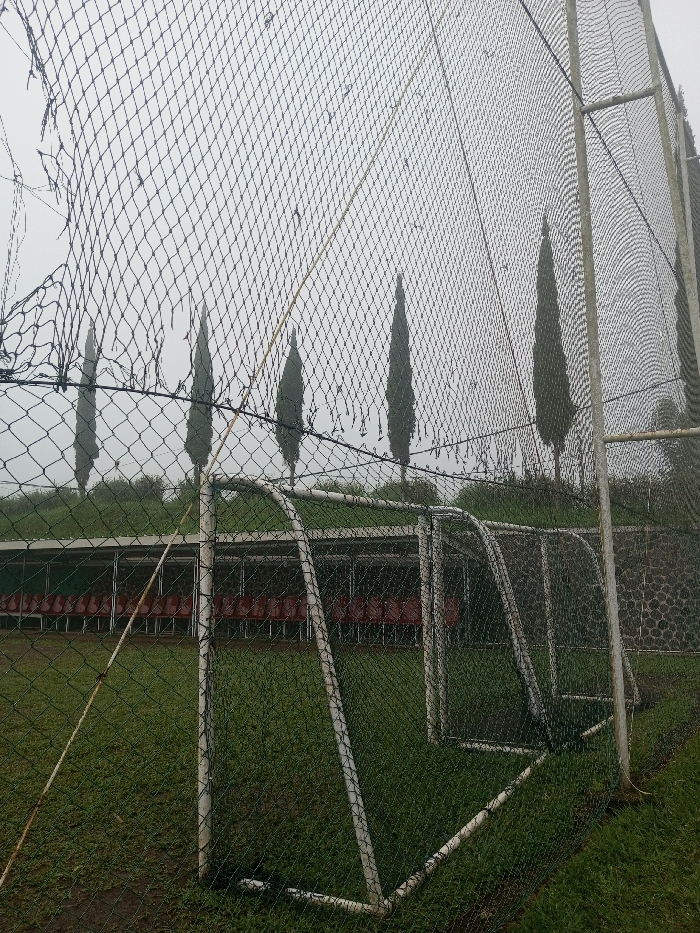 The image displays an outdoor sports facility in Irupalai, Sri Lanka, under overcast or foggy atmospheric conditions. In the foreground, a dark mesh containment netting, exhibiting tears in its upper-left section, partially obstructs the view. A white-framed soccer goal stands on a green grass field immediately behind this netting. Further in the midground, a prolonged structure with a white roof and multiple rows of unoccupied red seats is visible, indicating a spectator stand or dugout. Behind this structure, a grassy embankment leads up to the background. At least five tall, slender, dark green trees, possibly cypress, are silhouetted against a uniformly grey, misty sky. A dark stone retaining wall is partially visible on the far right. No individuals, actions, or interactions are present in the scene.