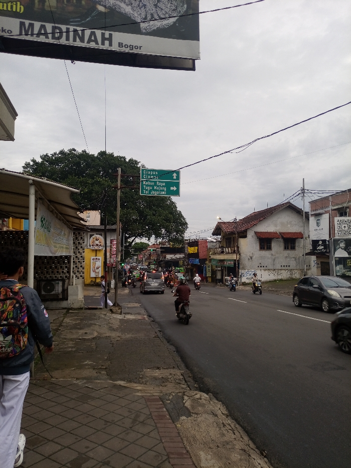 A street scene in Bogor under a cloudy sky