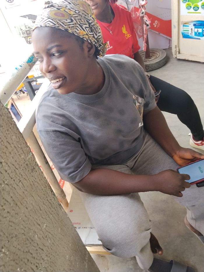 This scene is located in Fagge A, Nigeria, depicting two individuals in a bright, semi-outdoor urban commercial setting. The primary subject is a dark-complexioned female, seated and angled towards the left edge of the frame. She has her mouth slightly open, suggesting she is speaking or reacting. She wears a multi-patterned headscarf (featuring yellow, black, white, and gold motifs), a faded grey short-sleeved t-shirt with a graphic design, and light grey sweatpants. Her left hand holds a red-cased smartphone displaying a blue screen. Her visible left foot is bare, and her right foot wears a dark slide. Partially visible behind her to the right is another individual, likely female, wearing a red t-shirt with a white "Liverpool FC" logo and a silver crucifix necklace. She is also seated, wearing black leggings and white sneakers with red accents on her visible left foot. The immediate foreground on the left features a textured beige wall. The background includes white and brown structural supports, a metal pole, a vehicle tire resting on the ground, and various commercial signs, including visible "dato" and "EASYBUY" branding, as well as faint green and blue signage, indicative of a storefront or market area. The ground surface appears to be concrete.
