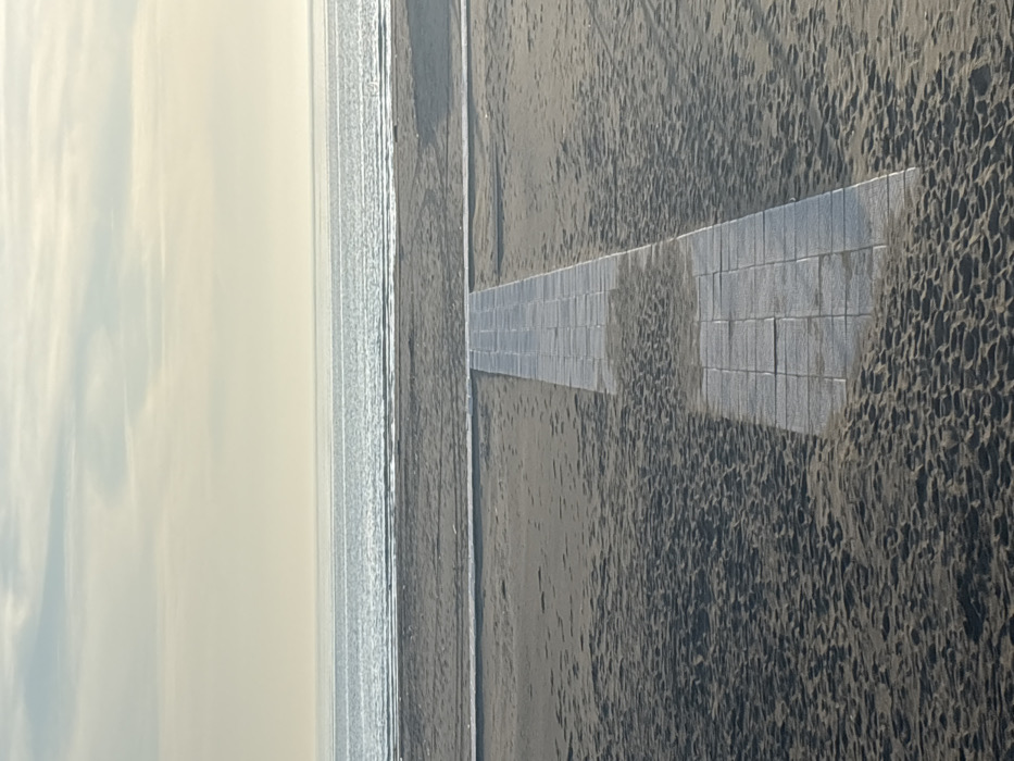 The image depicts a tranquil coastal scene on a beach in Donji Štoj, Montenegro. A light gray, tiled or planked pathway, approximately two meters wide, extends directly from the foreground into the midground, leading towards the ocean. This main pathway is intersected perpendicularly by a narrower, similar light gray pathway, creating a cross-like formation on the dark gray sand. The sand itself is textured with numerous small undulations and depressions, consistent with footprints or wind patterns. No individuals or subjects are present on the beach or pathways. Beyond the sandy expanse, the calm, light blue-gray ocean stretches horizontally to the horizon. The sky above is a pale, hazy yellowish-white, with faint, wispy cloud formations, indicating an overcast or soft light condition. No specific actions or interactions are occurring.