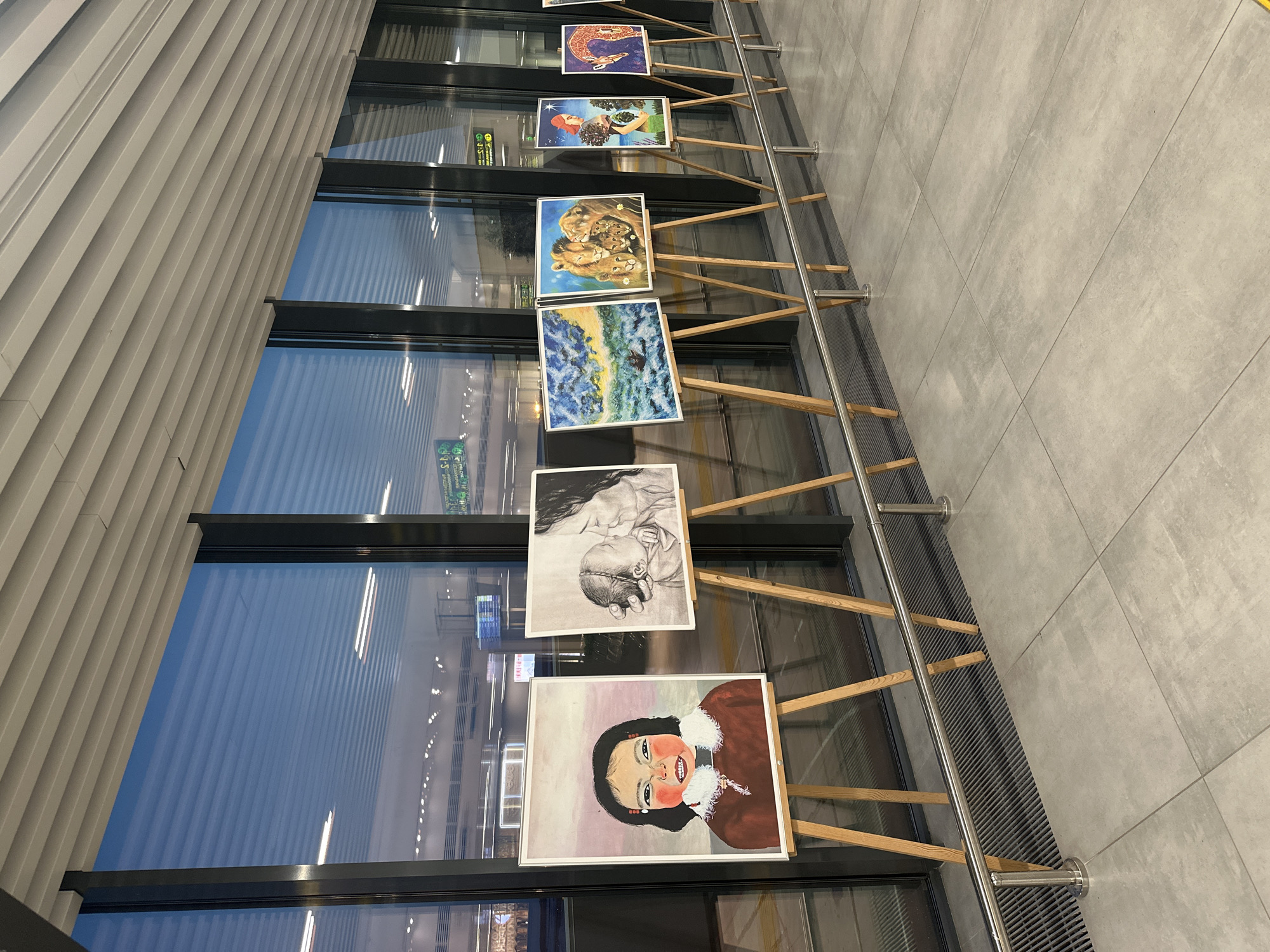 An indoor art exhibition is presented along a windowed wall within the Ufa International Airport, Ufa, Russia