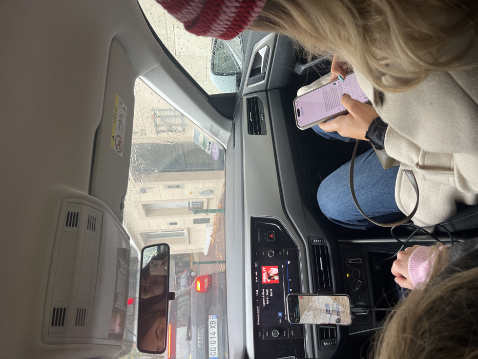 The image depicts the interior of a vehicle on a rainy, overcast day in Rueil-Malmaison, France, observed from a rear or slightly offset front passenger perspective. Raindrops are visible on the windshield. In the rearview mirror, a female driver with dark hair is reflected, holding a smartphone to her face. To her right, a front passenger is visible, wearing a red and white striped knit beanie, a light-colored coat, and blue jeans. This passenger is actively operating a light-colored smartphone held horizontally, appearing to type or interact with the screen. A dark shoulder bag strap crosses her lap. On the far left, a hand wearing a light pink sleeve holds a black cable connected to a smartphone mounted vertically on the dashboard, displaying a navigation application. The vehicle's central infotainment screen shows "FEEL IT" by "Capsalon & Mikan" playing at 11:54, with Bluetooth and Apple CarPlay active. An "AIRBAG" warning label is visible on the passenger-side sun visor. Outside the vehicle, an Audi with French license plate "GG-614-XB" is stopped directly ahead, its brake lights illuminated on the wet street. Light-colored buildings with white window frames and brown doors line the street, with green bollards visible along the curb. Deciduous trees with autumn foliage are present on the left side of the road.