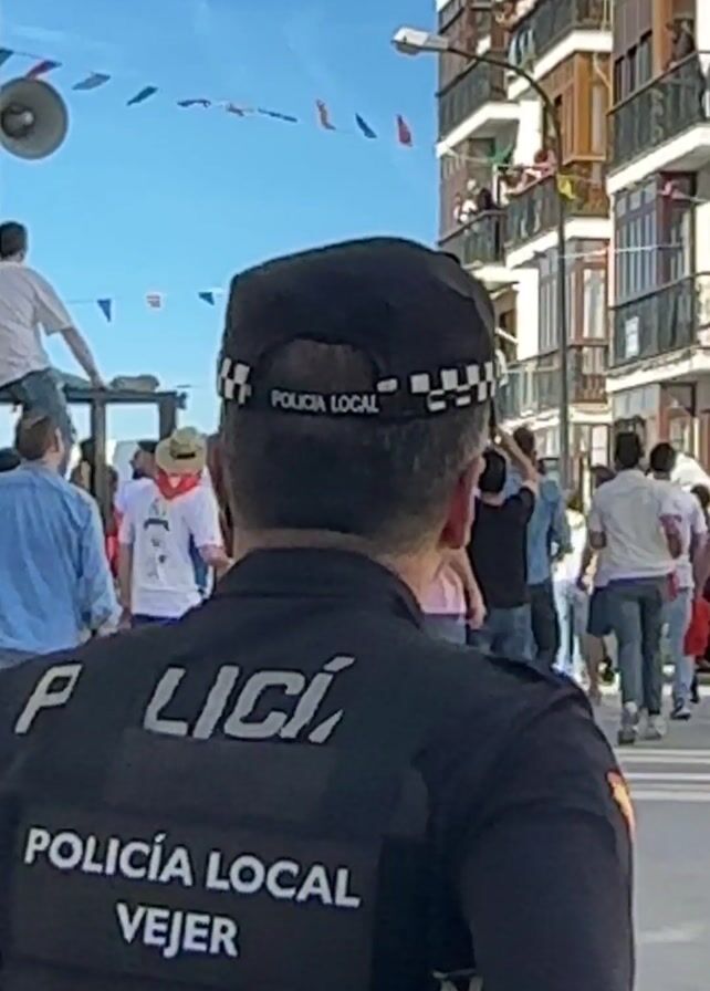 group of people walking down a street lined with buildings and strung with colorful pennants. A police officer is visible in the foreground. Many of the people walking are wearing white t-shirts, while some have other clothing items. Some people look up at someone sitting on top of a black structure. The sky is a clear blue.