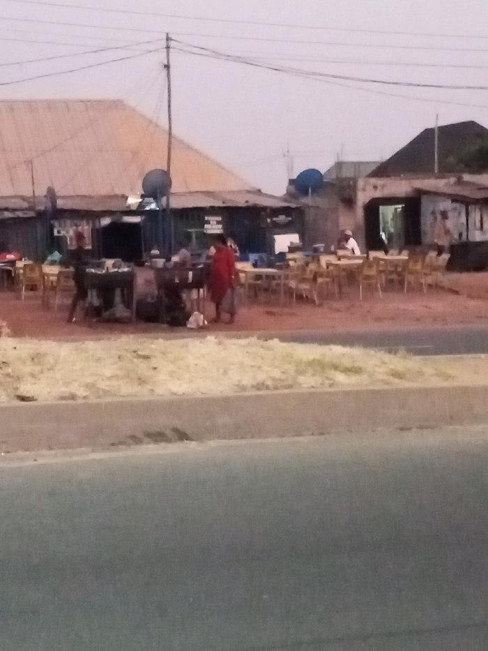 A daytime shot captures a roadside eatery. It features a makeshift structure with a corrugated metal roof, satellite dishes, and tables with chairs scattered outside. People are seen milling about near what appears to be a cooking area, with one person wearing a red robe. The scene is set against a muted sky with power lines visible above. A road in the foreground suggests the eatery is located along a thoroughfare.