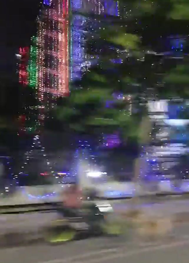 A vehicle drives down a brightly lit road at night. Buildings are decorated with lights in multiple colors. The median has small trees decorated with white and blue lights. Pedestrians are seen walking on the sidewalk. Other vehicles, including motorcycles and cycle rickshaws, are also present on the road. Streetlights illuminate the scene. The weather appears clear.