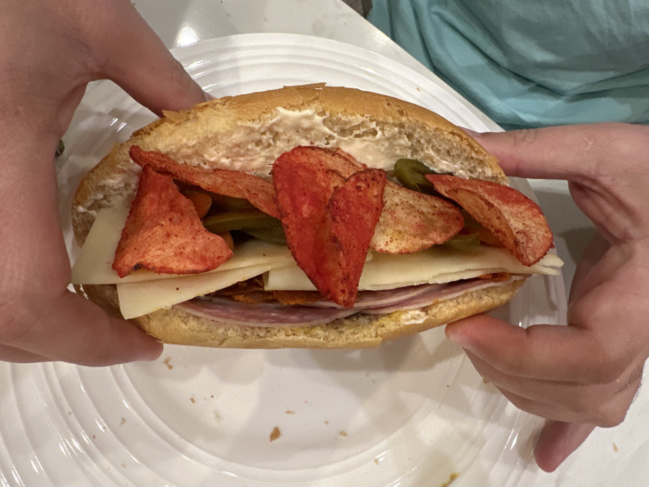 - "The image displays a close-up, top-down view of a sub sandwich being held horizontally by two hands over a white ridged plate" by FM-GDBs83, licensed under CC BY 4.0