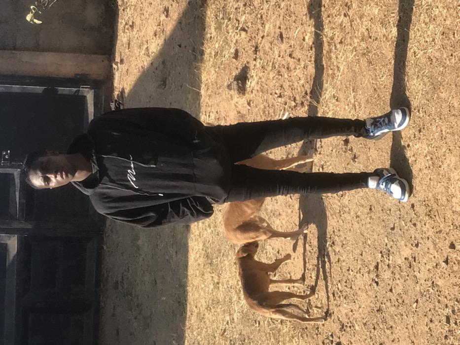 This image captures a young adult male standing in a dry, unpaved outdoor area, identified as a compound in Jos, Nigeria