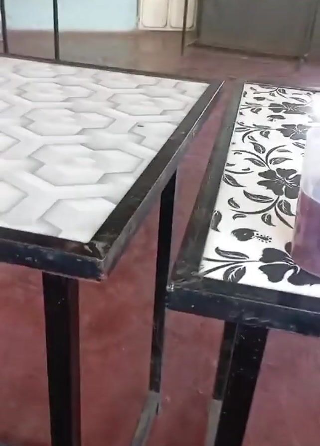 person sitting at a table with a purple drink on it. The table is black metal with a tile top. The floor is red. There is music playing in the background. The camera is pointed down at the person's legs and feet.