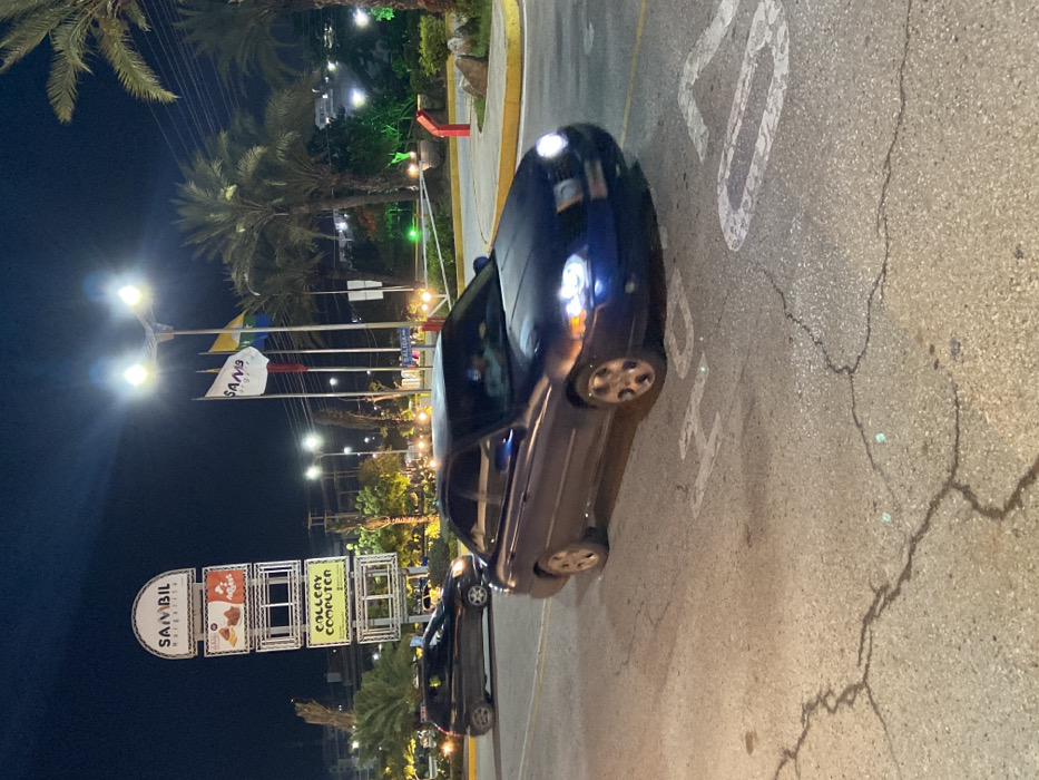 - "At night, a dark blue car parks on a gray, cracked asphalt road marked with the word "SPEED," in an outdoor area featuring palm trees and bright light posts" by FM-49R4h1, licensed under CC BY 4.0