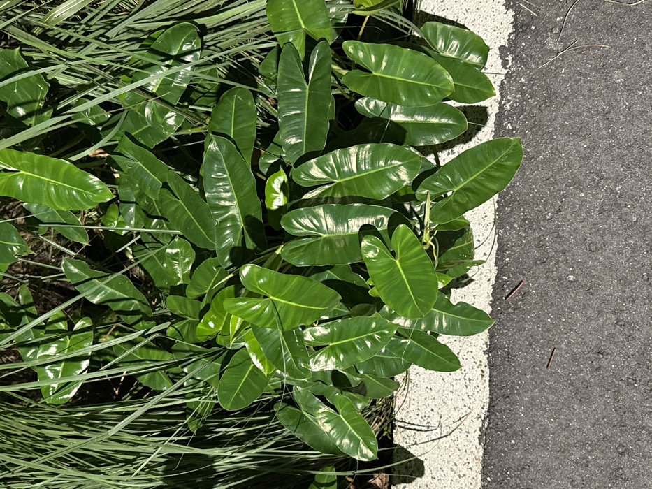 Lush green vegetation, including long bladed grass and large, ovate leaves with prominent veins, fills the left side of the frame. These glossy leaves suggest a tropical plant. To the right, a white-painted border separates the plants from an expanse of gray asphalt. Bright sunlight reflects off the leaves and casts shadows on the nearby pavement.
