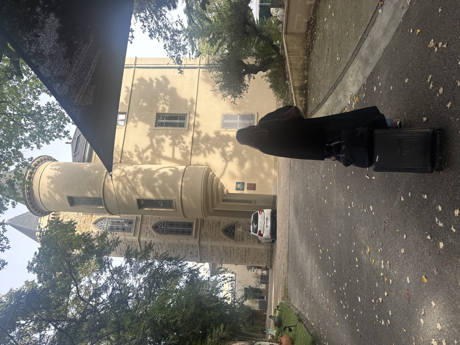 The image depicts a female subject, viewed from behind, walking along a paved driveway towards the Château de la Ferrandière in Villeurbanne, France. She has long dark hair and is wearing a long dark coat over blue jeans, pulling a black ribbed rolling suitcase with a black duffel bag stacked on top. A brown shoulder bag is carried on her right shoulder. The dark paved driveway is scattered with yellow and brown autumn leaves. The prominent building, identified as the Château de la Ferrandière, features a multi-story structure. The section to the right of the driveway has a light beige facade with a distinctive rounded tower topped by a dark conical roof. This section includes rectangular windows, one of which on the lower level has closed louvered shutters. A small blue rectangular plaque is affixed to this beige wall. To the left, the building transitions to a stone facade characterized by gothic-style pointed arch windows. A dark conical turret roof is partially visible above this stone section. A white compact car, identified as a Citroën C3 with French license plate FV-554-XB, is parked to the left of the building's entrance. The scene is framed by numerous green trees with deciduous leaves and various shrubs. A dark, triangular shade sail is partially visible in the upper right corner of the frame. The environment is well-lit by natural daylight, casting discernible shadows from the trees and building.