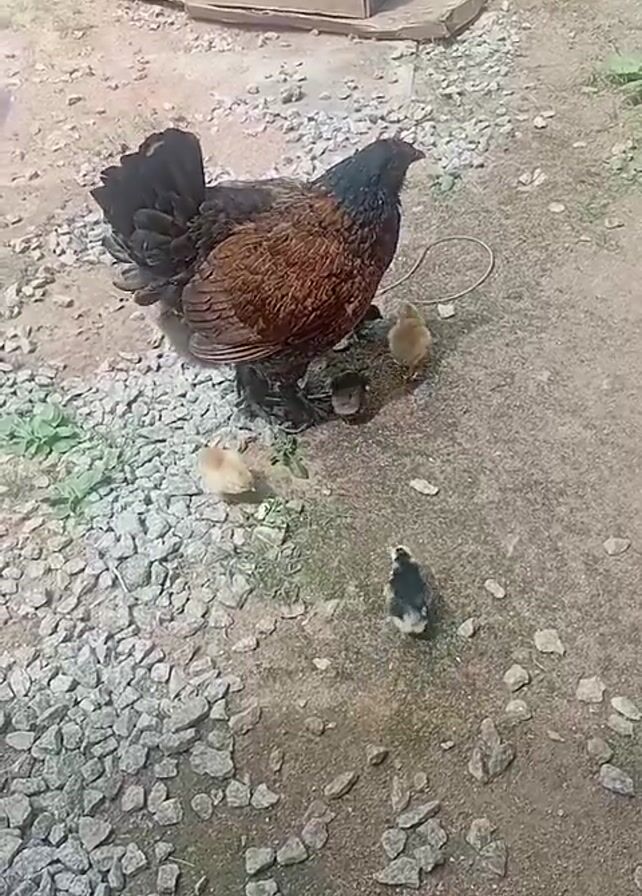 - "brown chicken with a black tail standing on a gravelly surface with her four chicks" by FM-sJmY43, licensed under CC BY 4.0