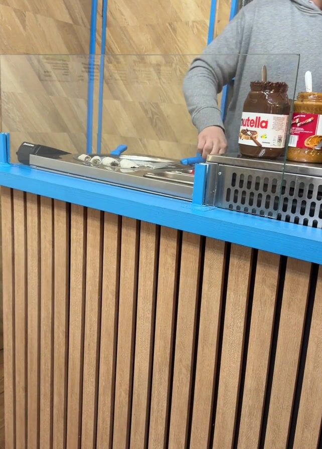 young man in a gray hoodie preparing a snack behind a food counter. He uses tongs to take something from a small white container and places it on a heated surface. Behind him on the counter are jars of Nutella, a jar of Biscoff spread, and another jar with a green substance. The counter has a blue frame and is covered with vertical wooden slats. A clear barrier separates the counter from the customer side. A YouTube logo is visible on the wall behind him.