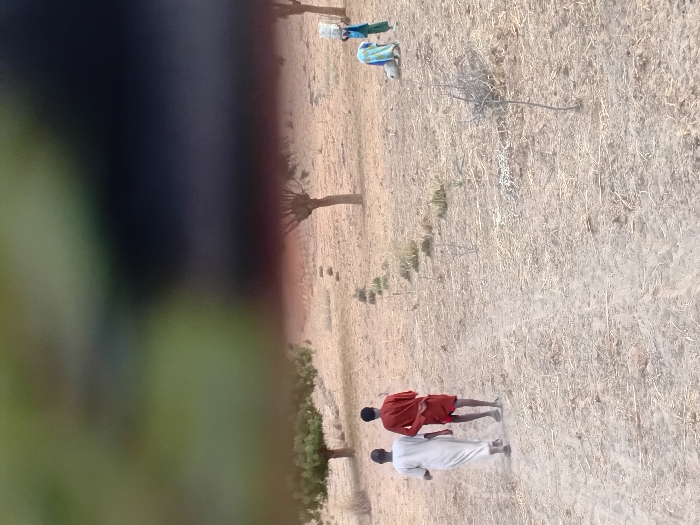 Two men walk across a dry, grassy field. One man wears a white robe, the other a red shirt and shorts. In the distance, a few trees stand in the barren landscape. Laundry hangs on a line. The image has a large blurry section on the left side.