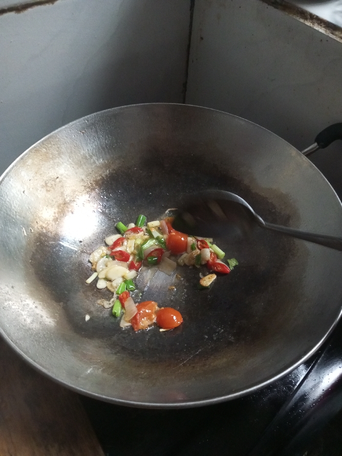 In a kitchen in Ariyalai East, Sri Lanka, a dark, well-used metallic wok contains a mixture of sautéing ingredients. The ingredients include chopped white onions or shallots, green scallions, small red cherry tomatoes, and sliced red chilies, all glistening with oil at the bottom of the wok. A dark metallic slotted spoon is positioned over the ingredients, indicating active stirring. The wok rests on a dark stovetop or countertop, with a dark wooden surface visible to the lower left. The background features a light-colored kitchen wall, showing minor discoloration and a corner joint. No people are visible in the scene.