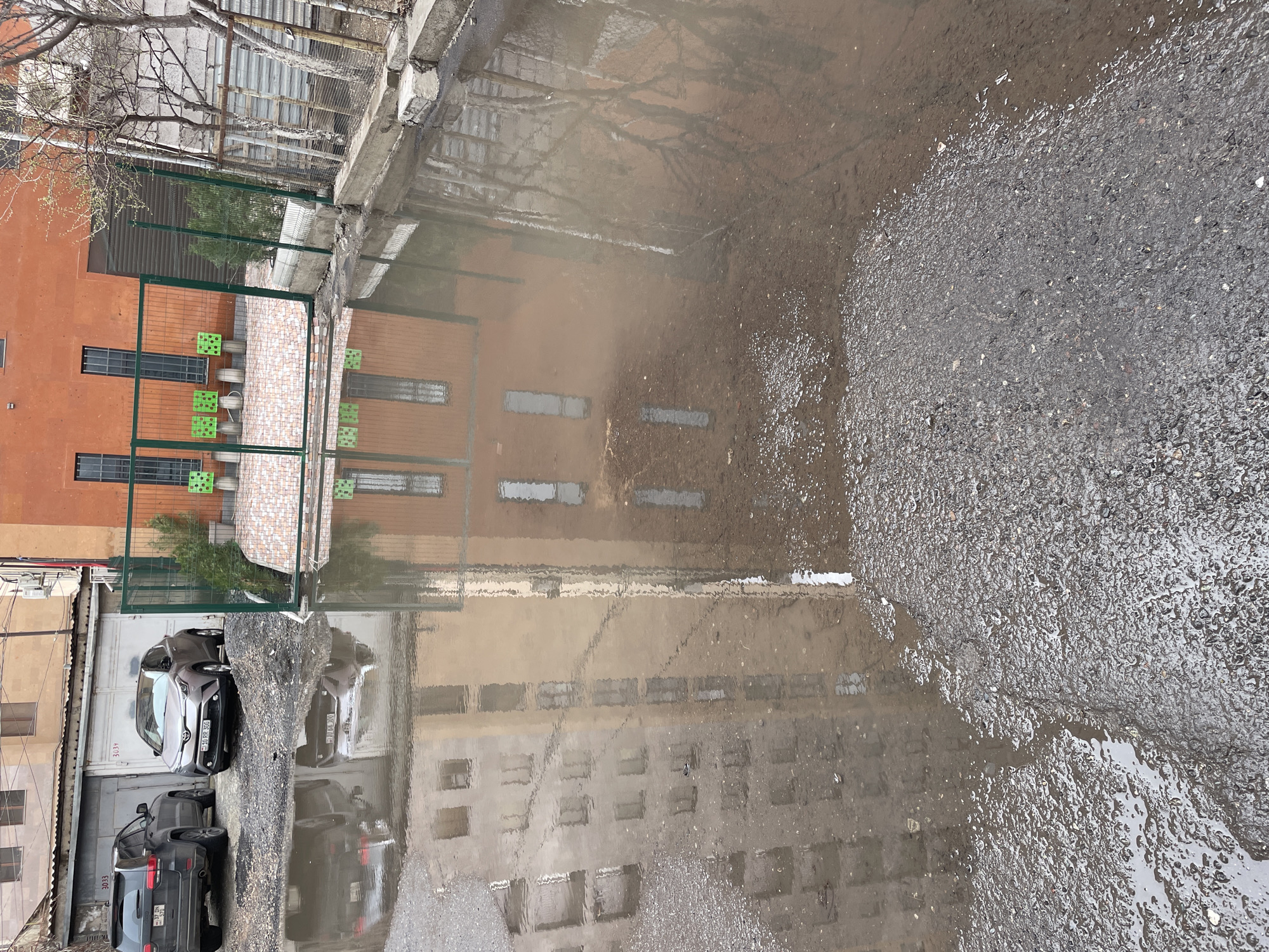 flooded street in Yerevan, Armenia. Several parked cars are visible near garage doors. A multi-story building is reflected in the puddle along with a green metal fence and some trees. The pavement is wet and reflective. The building is orange and has dark windows. The weather appears overcast.