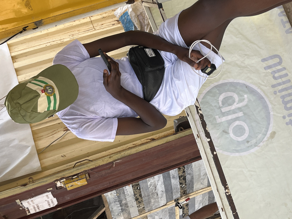 This image shows a dark-skinned individual seated outdoors in Maiduguri, Nigeria, against a backdrop of corrugated metal structures and a commercial banner